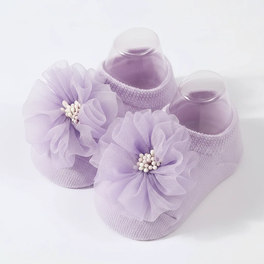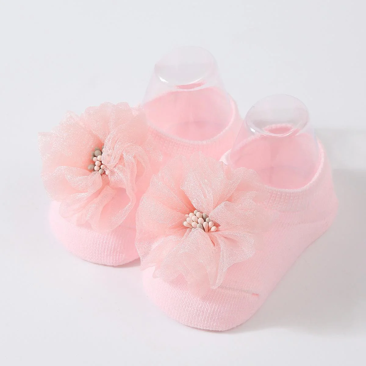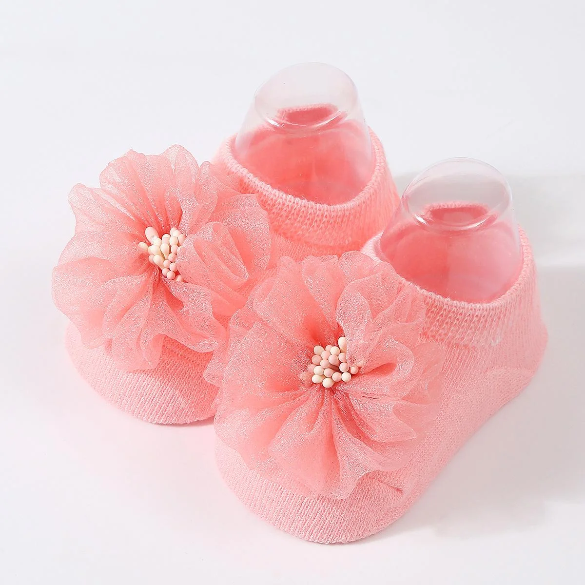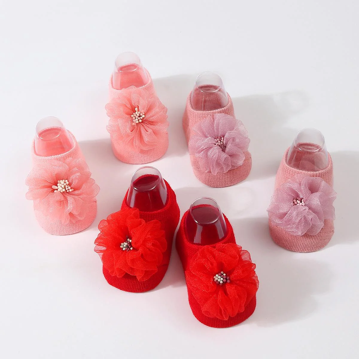 1 pair organza baby non slip floor socks handmade adhesive knitted childrens' socks solid color breathable walking baby socks