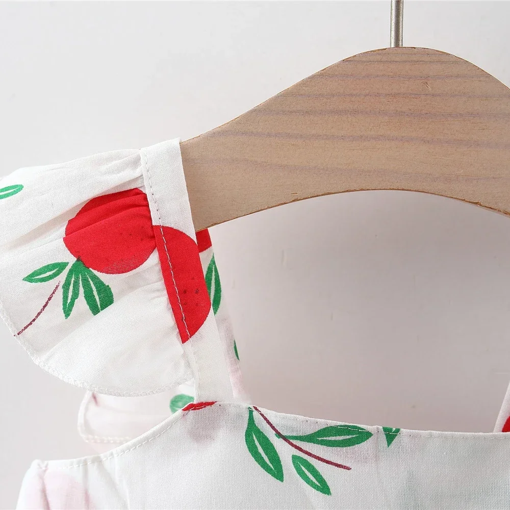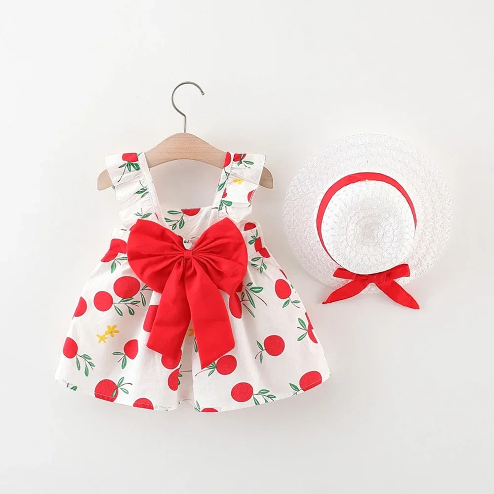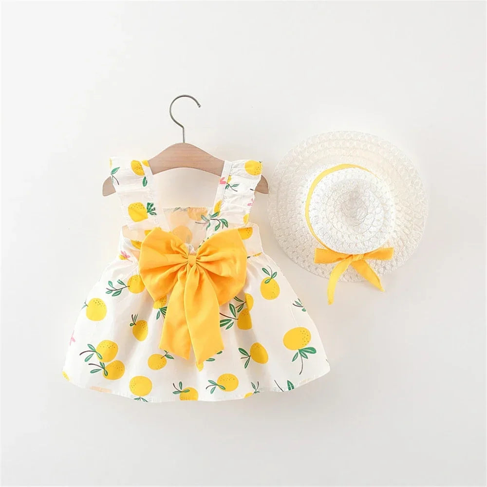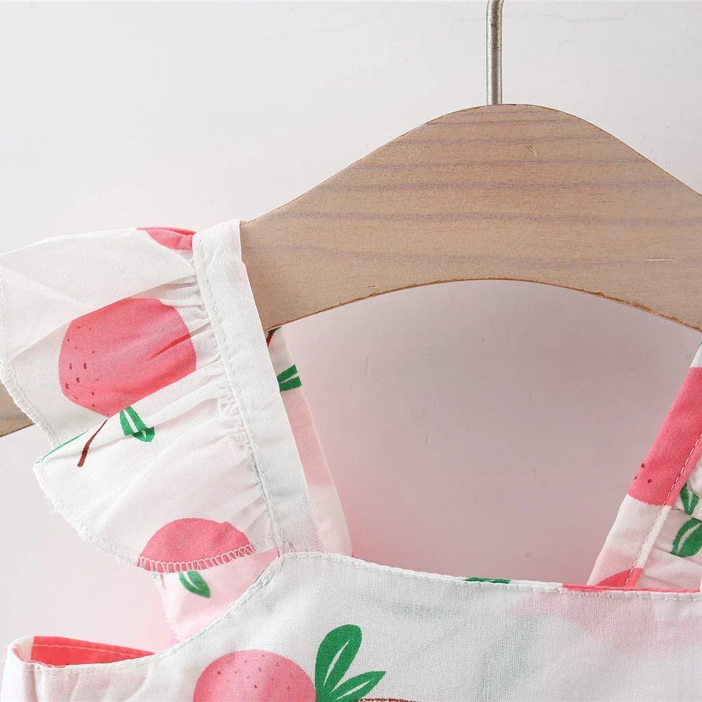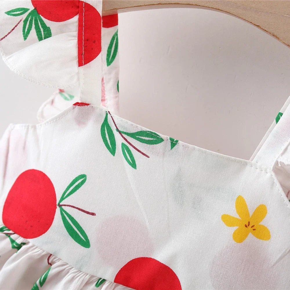 Summer New Girls Dress + Hat 2-Piece Fruit Print Small Fresh Bow Halter Small Flying Sleeve Tmall Princess Dress