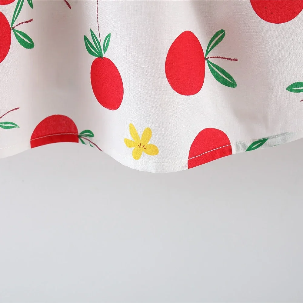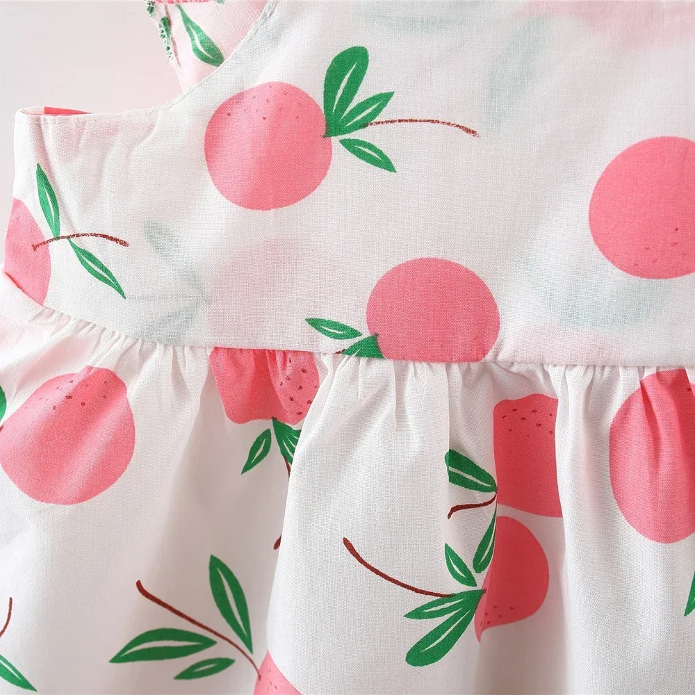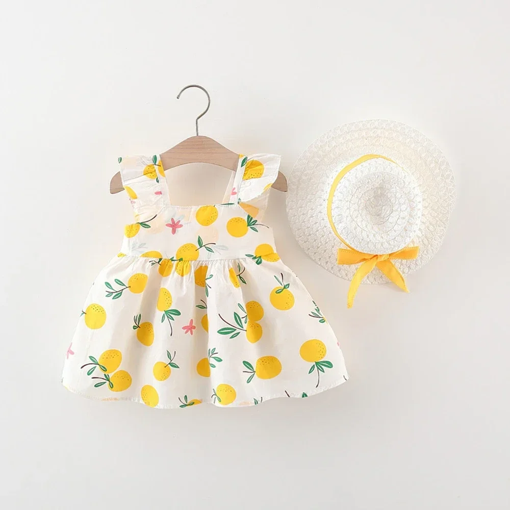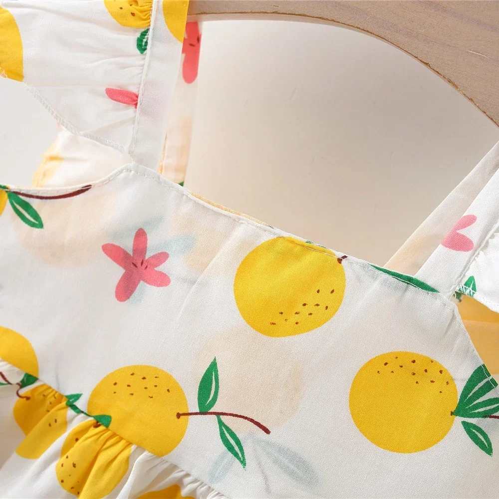 Summer New Girls Dress + Hat 2-Piece Fruit Print Small Fresh Bow Halter Small Flying Sleeve Tmall Princess Dress